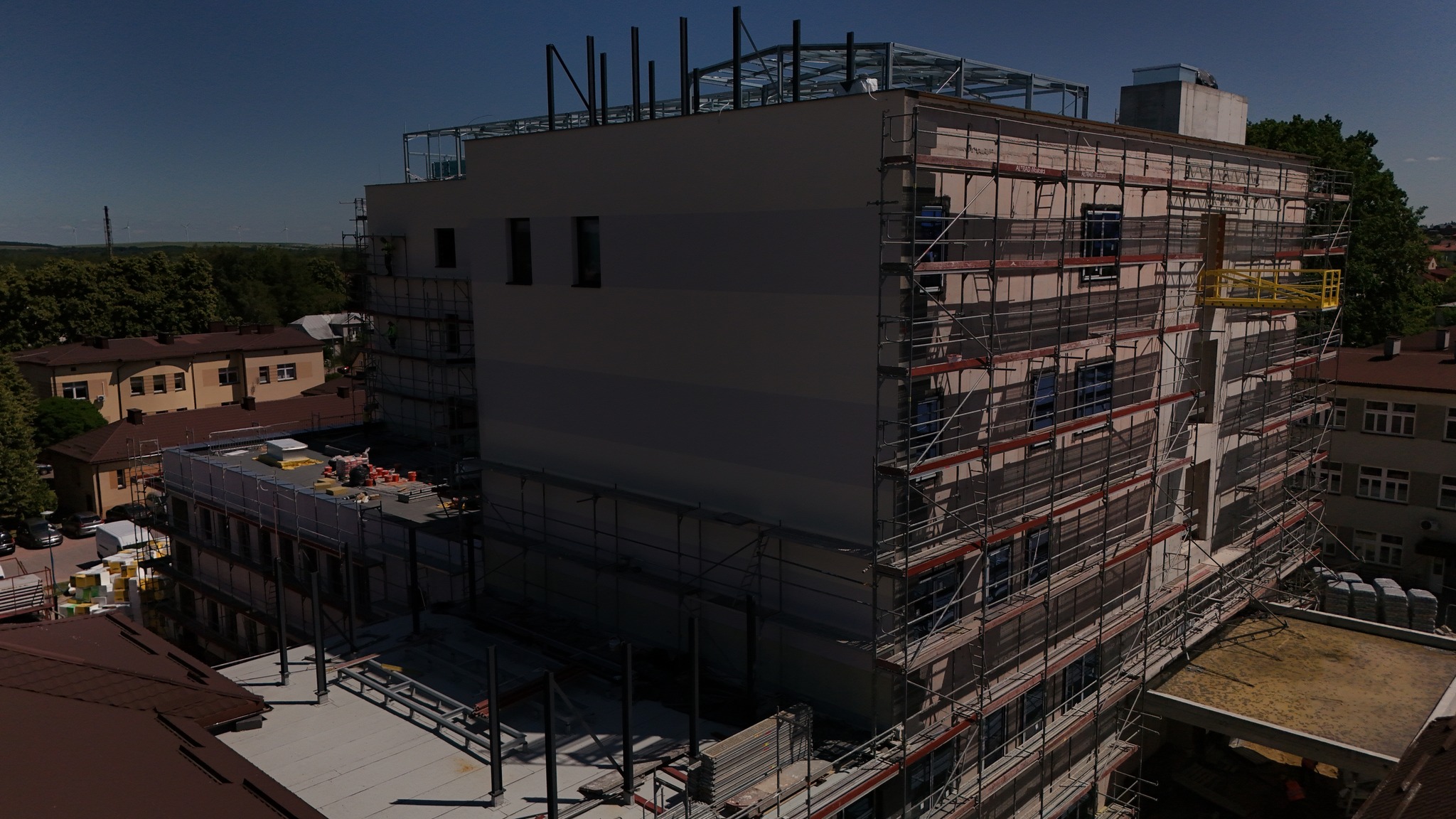 Wnętrza również zyskują swoją funkcjonalność! Wzniesiono już większość ścianek działowych, które wyznaczają przyszłe gabinety, sale i pomieszczenia techniczne. Na sufitach rozprowadzono liczne instalacje: wentylacyjne, elektryczne i wodno-kanalizacyjne – to kluczowe systemy, które zapewnią odpowiednie warunki i komfort użytkowania. W wielu pomieszczeniach trwają już zaawansowane prace wykończeniowe i montaż niezbędnych urządzeń technicznych. Na dachu budynku zamontowano już nowoczesne centrale wentylacyjne – to one będą dbać o stały dopływ świeżego powietrza do wszystkich pomieszczeń!
