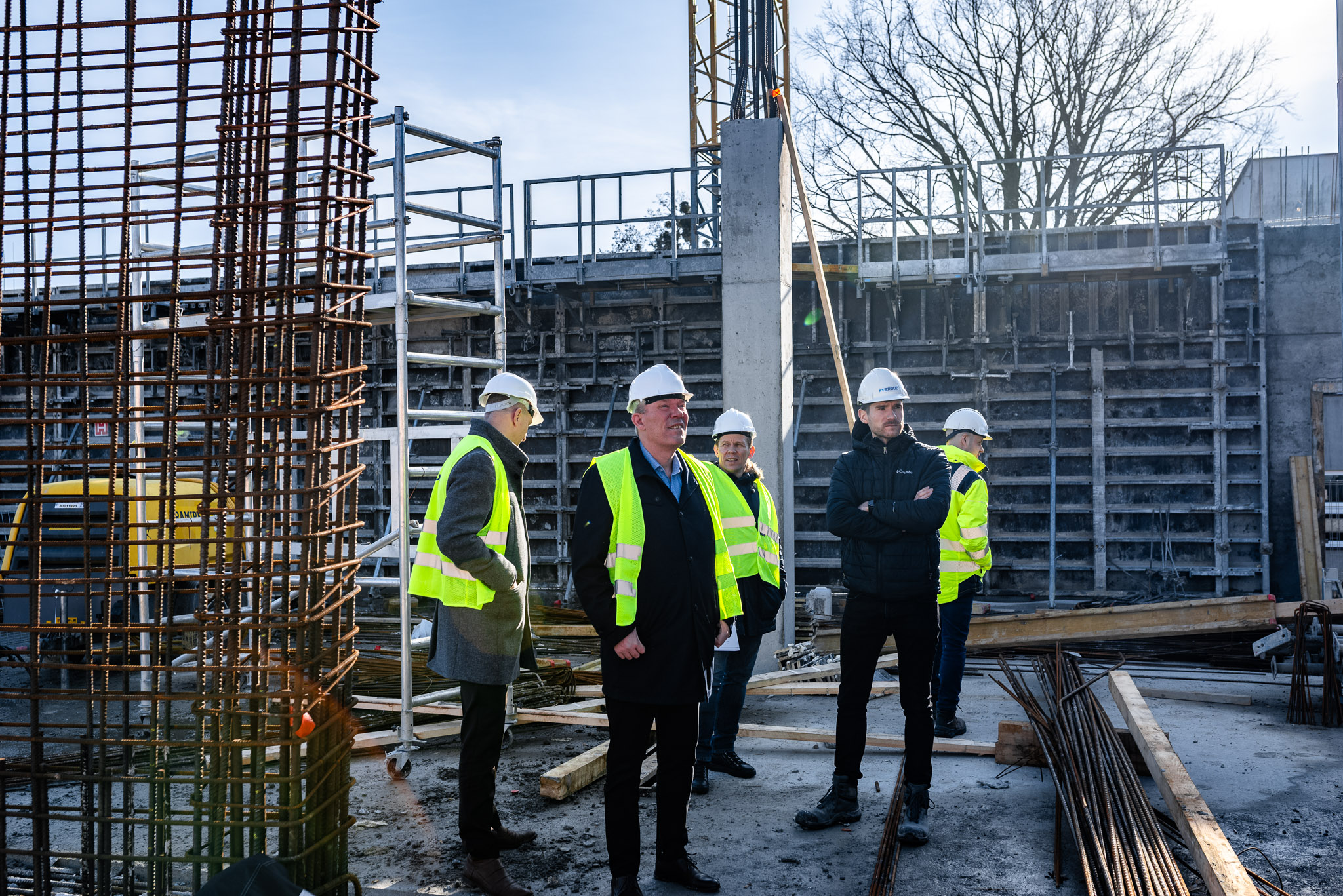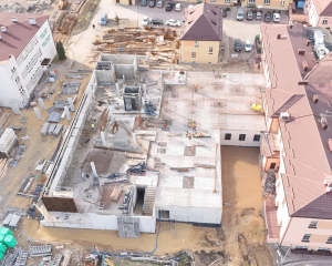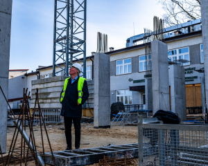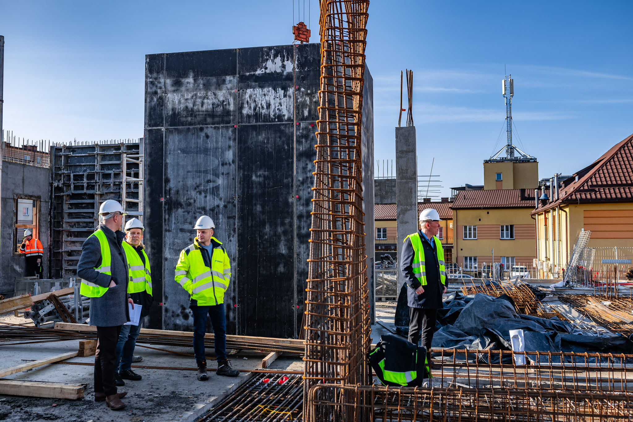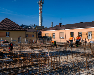 Kontynuowane są również roboty konstrukcyjne w budynku głównym, gdzie powstają kolejne żelbetowe ściany i słupy na piętrze+1. Rozpoczęto też prace murarskie w zakresie ścian działowych w kondygnacji piwnicy. Zakończono wykonywanie zasypek wokół budynku i rozpoczęto montaż rusztowania, co oznacza przygotowania do montażu stolarki okiennej i robót elewacyjnych.