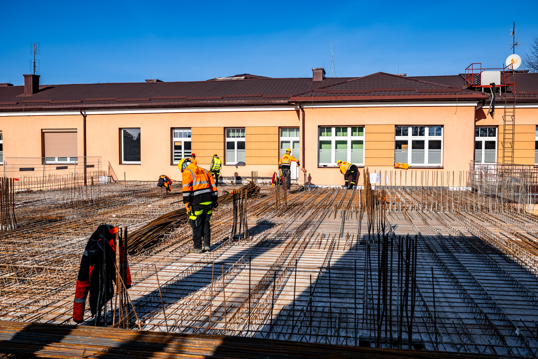 W ostatnim miesiącu prace skoncentrowane były na wykonaniu konstrukcji dwukondygnacyjnego budynku łączącego główny budynek bloku operacyjnego z istniejącym budynkiem Oddziału Chirurgii. W tym czasie zakończono konstrukcje fundamentów, ścian i słupów żelbetowych, a w dniu dzisiejszym zabetonowano strop nad parterem.