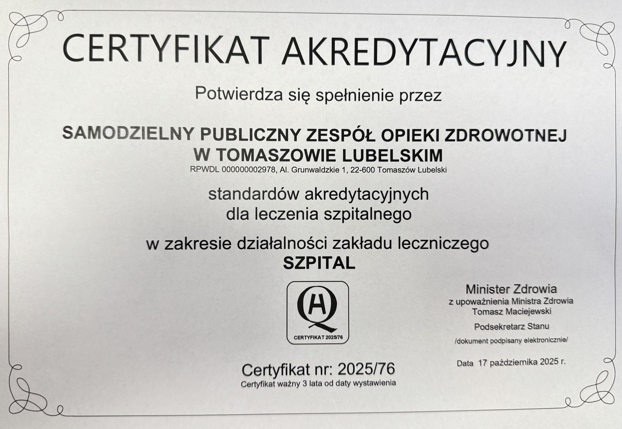 Dzięki ogromnemu zaangażowaniu pracowników szpitala, możliwe było uzyskanie tak wysokiej oceny. Najwyższy poziom akredytacyjny świadczy o stałym dążeniu Samodzielnego Publicznego Zespołu Opieki Zdrowotnej w Tomaszowie Lubelskim do doskonalenia jakości usług oraz bezpieczeństwa pacjentów.