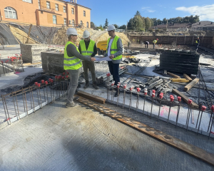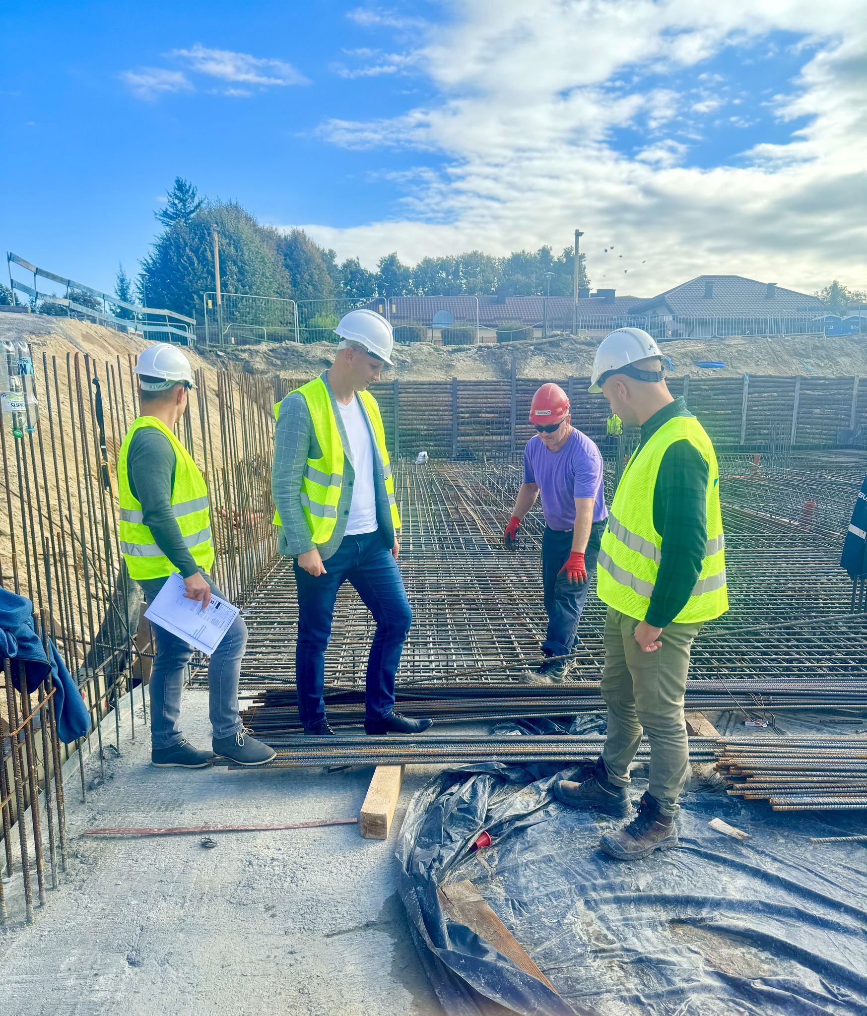 Prace ziemne w obszarze podpiwniczenia budynku również zostały zakończone. Położono beton podkładowy pod całą płytą fundamentową, na którym następnie rozpoczęto montaż zbrojenia oraz wykonano instalację kanalizacyjną i instalację odgromową znajdującą się w płycie fundamentowej. Równocześnie realizowana jest hydroizolacja części podziemnej.