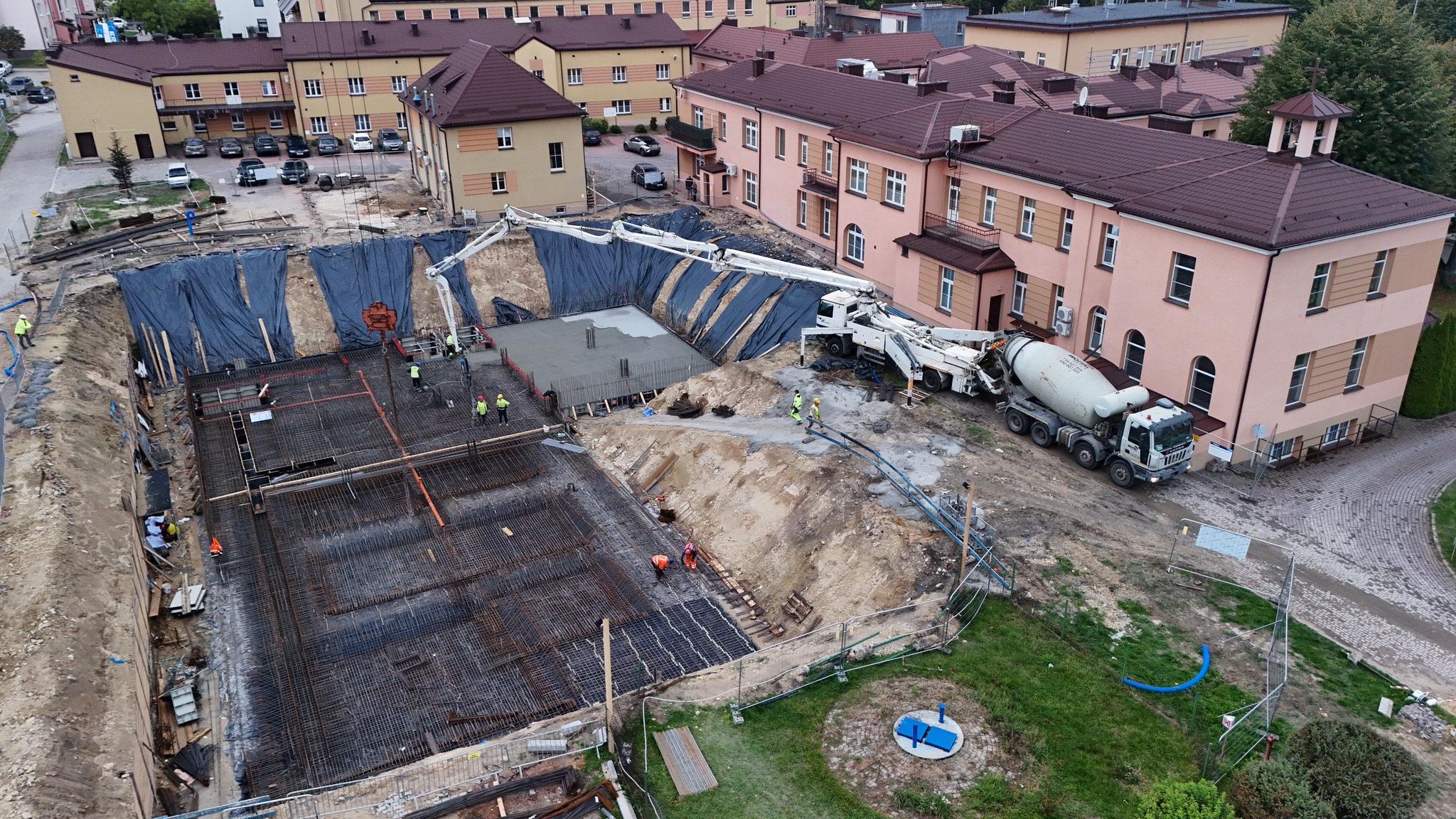 Prace przy budowie nowego budynku szpitala są na etapie realizacji konstrukcji części podpiwniczonej. Zakończono już wszystkie przygotowania, które obejmowały usunięcie drzew i krzewów znajdujących się na terenie budowy oraz przeniesiono sieci sanitarne i elektryczne, które kolidowały z projektem budynku szpitala. Kolejnym krokiem było zabezpieczenie wykopu, który zrealizowano przy użyciu tzw. ściany berlińskiej, co zapewnia stabilność ścian wykopu podczas dalszych prac.