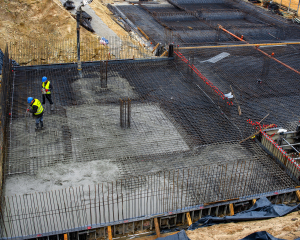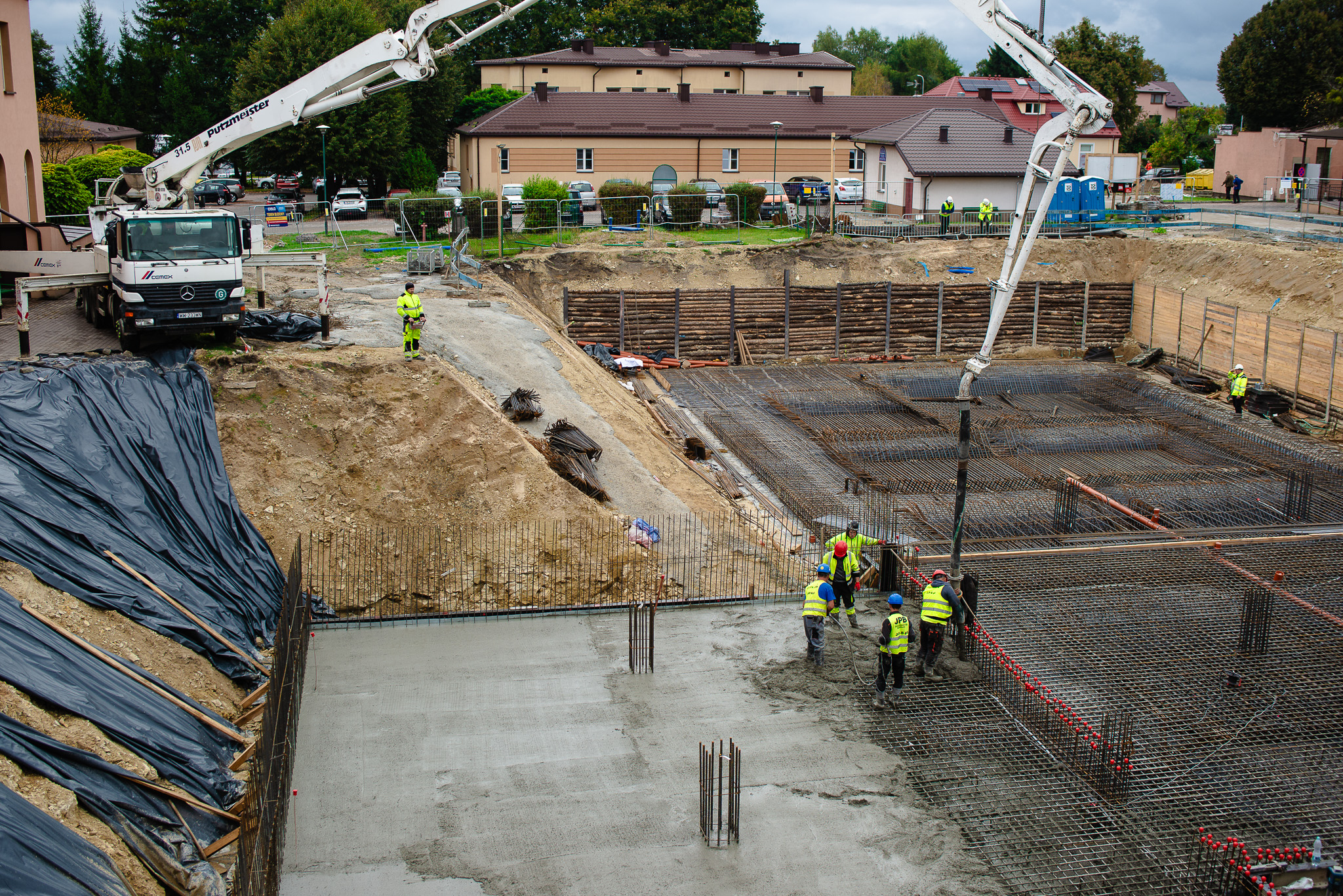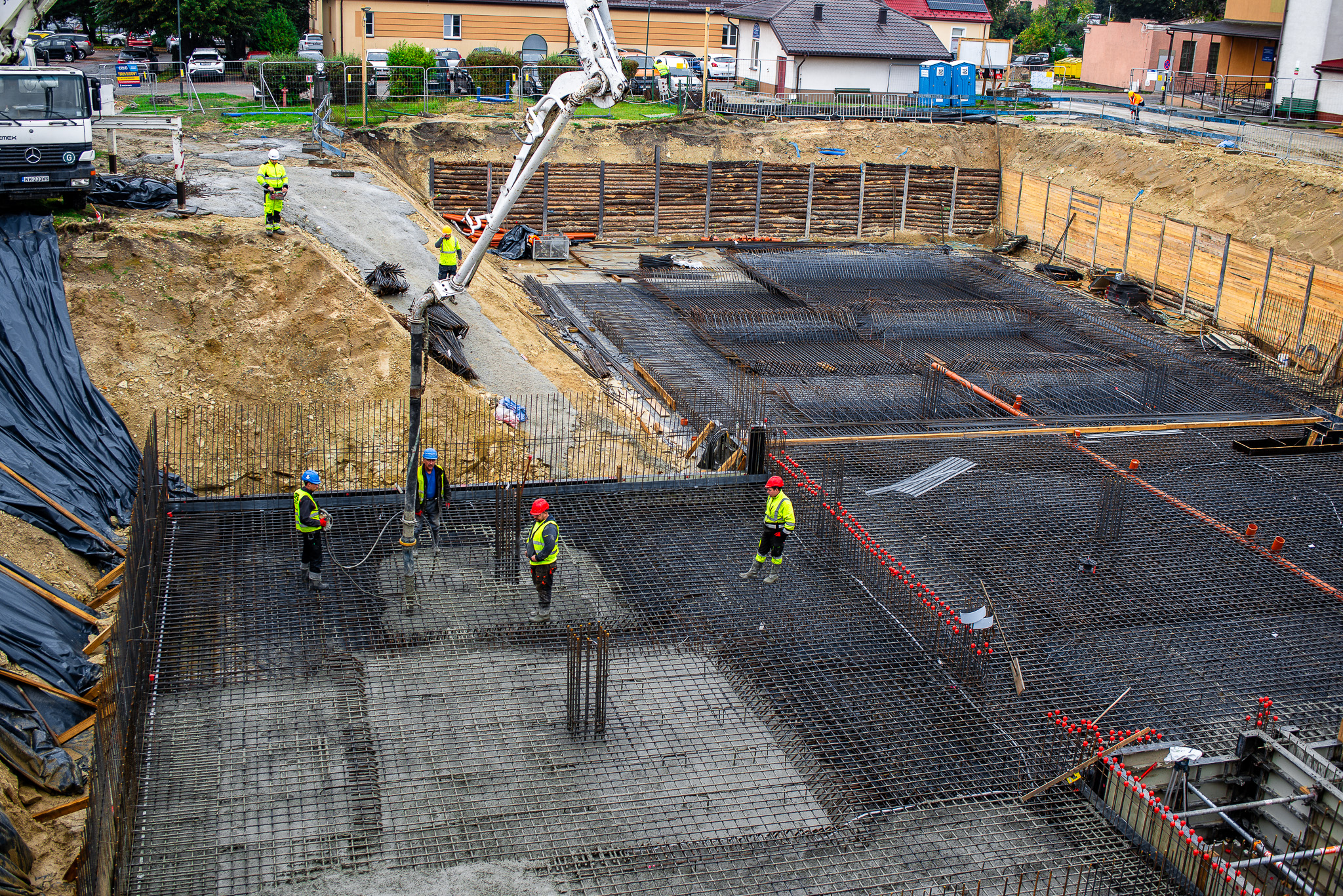 Wykonano już betonowanie około 60% płyty fundamentowej, a obecnie trwają prace nad zakończeniem zbrojenia pozostałej części. Dodatkowo zrealizowano już instalację kanalizacji deszczowej, która będzie odprowadzać wodę z parkingu.